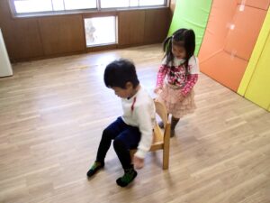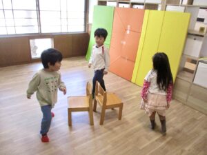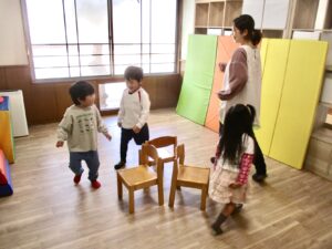 先生とお友達と一緒にイスとりゲーム! さんぽの曲がなっている間イスの周りを歩きます! 歩こう~歩こう~♪