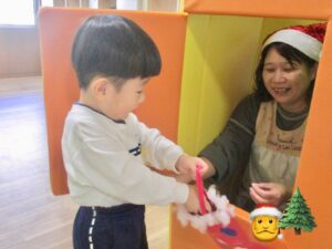 「ちょうだい」と伝えて、サンタになった先生からお菓子をもらいました🎅