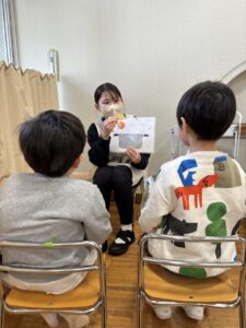 年少さんは発表会で日頃取り組んでいるあつまりやお勉強の様子を見てもらいます! お友だちや先生と一緒に、「カレーライスのうた」のペープサートを見ているところです👀