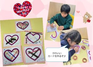 バレンタインはどんなイベントなのかを、みんなで確認してメッセージカードを作りました💌 感謝を伝えたい相手をイメージしながら、テープやペンで飾り付けをしました✨ 「喜んでくれるかな?」 「なんて書こうかな🤔」 世界に一つの素敵なメッセージカードができました😊