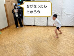 まずは、タンバリンの音が鳴っている間は動いて、音が止まったら体の動きも止める活動をしました✨